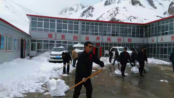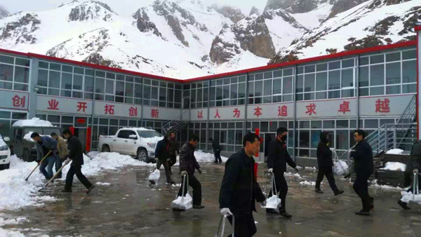 2016年3月21日青海共和縣青海銅鑫礦業(yè)有限公司礦區(qū)迎來(lái)了自春節(jié)以來(lái)的第一場(chǎng)大雪,前幾這里還太陽(yáng)高照,天氣晴朗,與此同時(shí)洛陽(yáng)陽(yáng)光明媚,鳥(niǎo)語(yǔ)花香,現(xiàn)在青海銅鑫礦區(qū)則被厚厚的白雪覆蓋,呈現(xiàn)出另一番別樣的景像。青海分公司員工也一起參加礦山工作區(qū)的除雪工作,個(gè)個(gè)干得熱火朝天,一會(huì)兒大院里的雪就被清理完畢。