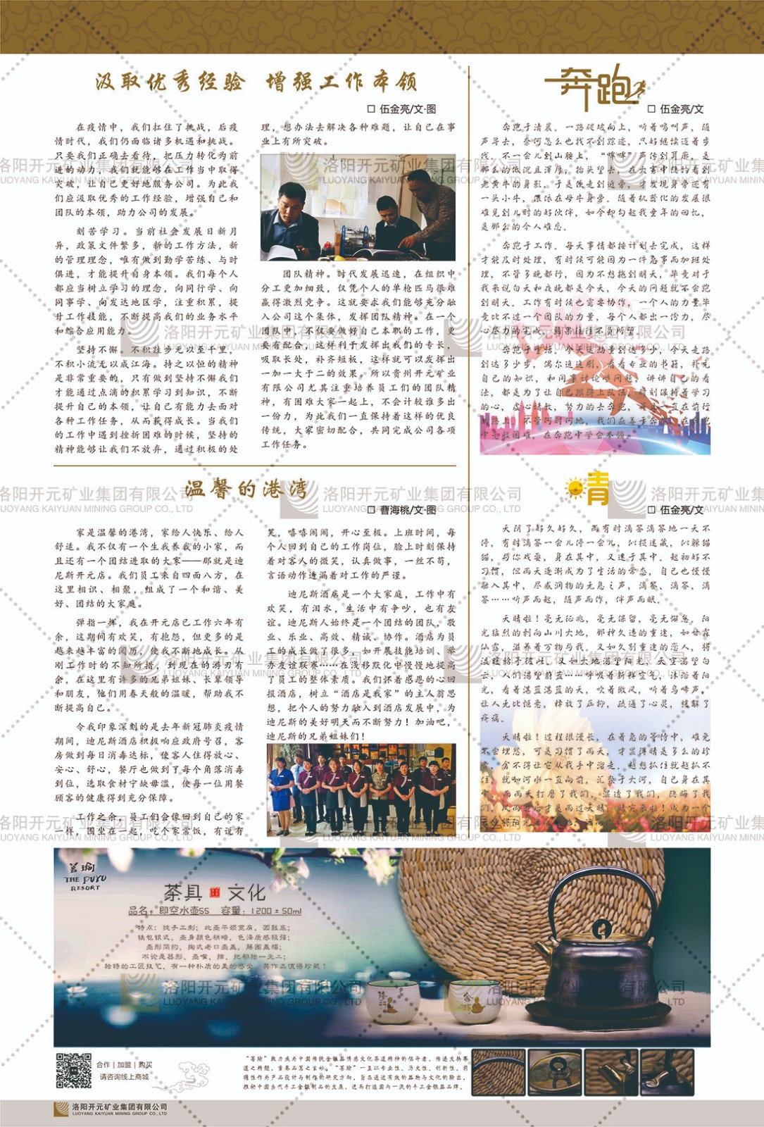 洛陽開元礦業(yè)集團(tuán)有限公司簡介洛陽開元礦業(yè)集團(tuán)有限公司,始成立于2006年,位于洛陽市開元大道269號。集團(tuán)旗下共有五余家全資子公司,業(yè)務(wù)涉及有色金屬礦山開發(fā)、礦產(chǎn)品購銷與進(jìn)出口貿(mào)易、房地產(chǎn)開發(fā)、文化藝術(shù)、企業(yè)管理與咨詢、資本投資等多個領(lǐng)域。民建河南省委委員、民建河南省委企業(yè)委副主任、民建洛陽市委委員、企業(yè)委主任、洛陽民建企業(yè)家協(xié)會會長許明月是公司創(chuàng)始人,現(xiàn)任洛陽開元礦業(yè)集團(tuán)有限公司董事長。在礦業(yè)領(lǐng)域,洛陽開元礦業(yè)集團(tuán)擁有多家實力雄厚的子公司:貴州開元礦業(yè)有限公司探、采礦權(quán)面積共11.33平方公里;興??h銅鑫礦業(yè)有限公司探礦權(quán)面積8.76平方公里,礦山資源潛力巨大;2021年,開元集團(tuán)與盧氏中科礦業(yè)有限公司開展戰(zhàn)略合作。盧氏中科礦業(yè)有限公司專注于有色金屬的浮選、加工和銷售,擁有強(qiáng)大的技術(shù)支撐平臺,是集探、采、選、冶、研為一體的中大型綜合礦業(yè)企業(yè)。目前,盧氏中科王家河1000噸選礦廠已成功投產(chǎn),雙河金礦、柳關(guān)欒盧鉛鋅礦相繼順利開工,樓房銀礦與圪老灣鉛鋅礦的深部探礦重大突破,標(biāo)志著礦山版圖取得重大進(jìn)展,為開元集團(tuán)后續(xù)發(fā)展奠定了堅實基礎(chǔ)。在文化傳媒領(lǐng)域,洛陽市明月美術(shù)館通過豐富多樣的藝術(shù)展覽、學(xué)術(shù)研討和公共教育活動,努力打造一個集展覽、交流、教育、研究為一體的綜合性藝術(shù)平臺。此外,在金融投資領(lǐng)域,開元集團(tuán)旗下的北京明峰資本管理有限公司專注于投資具有高增長潛力的優(yōu)秀企業(yè),特別是高科技、新能源、環(huán)保等新興產(chǎn)業(yè),為客戶提供個性化的資產(chǎn)配置服務(wù)。在做好企業(yè)經(jīng)營的同時,開元集團(tuán)始終不忘企業(yè)的社會責(zé)任和家國情懷,以突出的愛心公益事跡,開展了一系列公益慈善活動:“民建林”公益事業(yè)通過“思源基金”“幫幫公益”線上公益平臺,與眾多愛心人士籌措資金20余萬元;資助541名貧困大學(xué)生共計270余萬元,推進(jìn)“數(shù)字助力——河南AI人才培養(yǎng)”;捐款10萬元,馳援京津冀、黑龍江洪水地質(zhì)災(zāi)害……公司于2017年底被洛陽市慈善總會評為“洛陽慈善風(fēng)云榜——十大愛心集體”。洛陽開元礦業(yè)集團(tuán)有限公司秉承持續(xù)發(fā)展理念,憑借多年來良好的企業(yè)信譽(yù)與經(jīng)營業(yè)績,與全國多家企業(yè)建立了良好合作關(guān)系,受到社會各界的一致好評,多次榮獲“納稅標(biāo)兵”“先進(jìn)企業(yè)”“招商引資模范企業(yè)”等榮譽(yù)稱號。回望來時路,開元人勠力同心,以“闖”的精神和“創(chuàng)”的勁頭,一路披荊斬棘,踏過千山萬水;展望新未來,開元人凝心聚力,不執(zhí)于“舊”,無畏于“新”,秉承“勇于跨越,追求卓越”的企業(yè)精神,乘著國家高質(zhì)量發(fā)展新征程的東風(fēng),跨過高山,越過大海,向著集團(tuán)多元化、國際化的目標(biāo),逐夢遠(yuǎn)航,跨越前行!