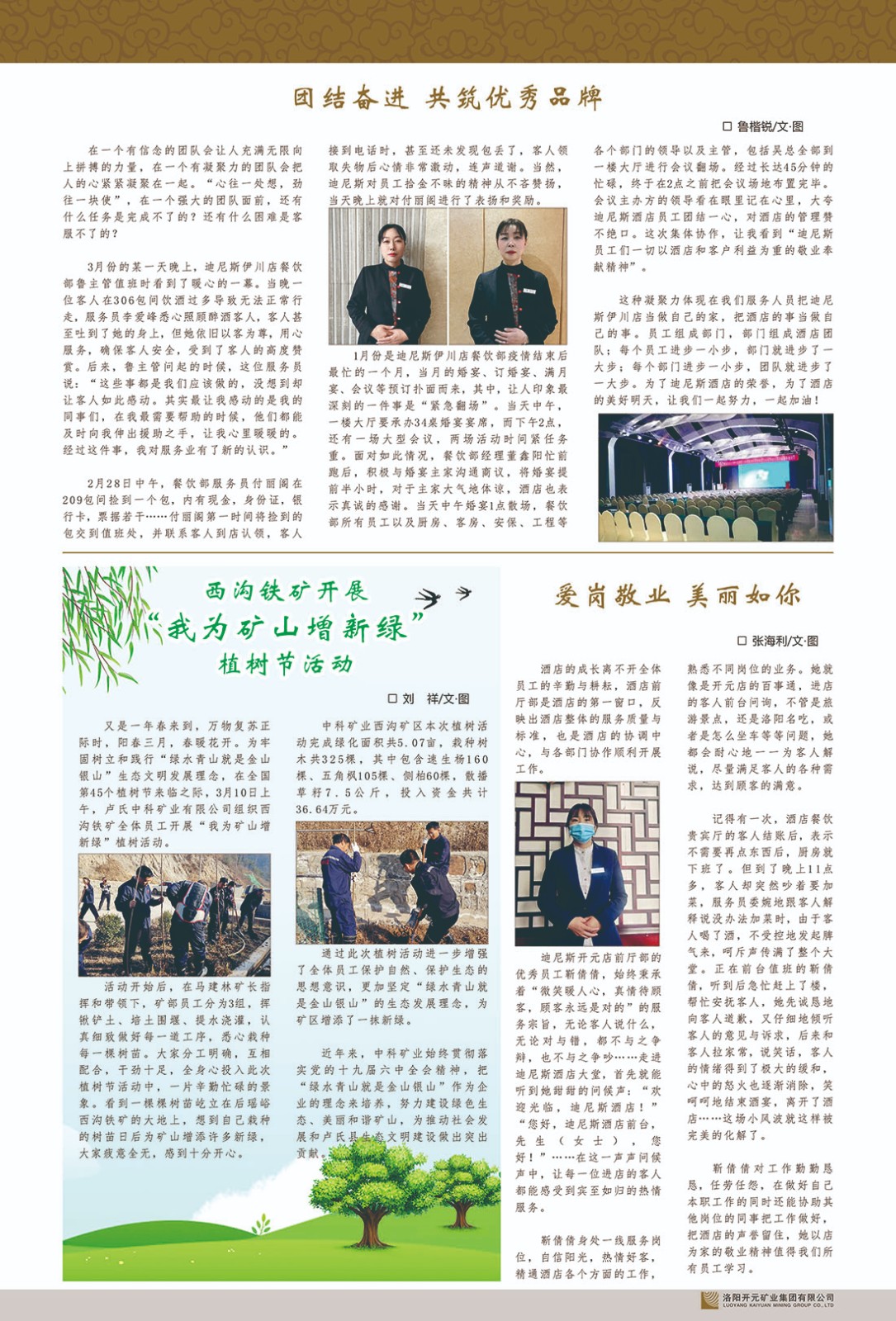 洛陽開元礦業(yè)集團(tuán)有限公司簡介洛陽開元礦業(yè)集團(tuán)有限公司,始成立于2006年,位于洛陽市開元大道269號(hào)。集團(tuán)旗下共有五余家全資子公司,業(yè)務(wù)涉及有色金屬礦山開發(fā)、礦產(chǎn)品購銷與進(jìn)出口貿(mào)易、房地產(chǎn)開發(fā)、文化藝術(shù)、企業(yè)管理與咨詢、資本投資等多個(gè)領(lǐng)域。民建河南省委委員、民建河南省委企業(yè)委副主任、民建洛陽市委委員、企業(yè)委主任、洛陽民建企業(yè)家協(xié)會(huì)會(huì)長許明月是公司創(chuàng)始人,現(xiàn)任洛陽開元礦業(yè)集團(tuán)有限公司董事長。在礦業(yè)領(lǐng)域,洛陽開元礦業(yè)集團(tuán)擁有多家實(shí)力雄厚的子公司:貴州開元礦業(yè)有限公司探、采礦權(quán)面積共11.33平方公里;興??h銅鑫礦業(yè)有限公司探礦權(quán)面積8.76平方公里,礦山資源潛力巨大;2021年,開元集團(tuán)與盧氏中科礦業(yè)有限公司開展戰(zhàn)略合作。盧氏中科礦業(yè)有限公司專注于有色金屬的浮選、加工和銷售,擁有強(qiáng)大的技術(shù)支撐平臺(tái),是集探、采、選、冶、研為一體的中大型綜合礦業(yè)企業(yè)。目前,盧氏中科王家河1000噸選礦廠已成功投產(chǎn),雙河金礦、柳關(guān)欒盧鉛鋅礦相繼順利開工,樓房銀礦與圪老灣鉛鋅礦的深部探礦重大突破,標(biāo)志著礦山版圖取得重大進(jìn)展,為開元集團(tuán)后續(xù)發(fā)展奠定了堅(jiān)實(shí)基礎(chǔ)。在文化傳媒領(lǐng)域,洛陽市明月美術(shù)館通過豐富多樣的藝術(shù)展覽、學(xué)術(shù)研討和公共教育活動(dòng),努力打造一個(gè)集展覽、交流、教育、研究為一體的綜合性藝術(shù)平臺(tái)。此外,在金融投資領(lǐng)域,開元集團(tuán)旗下的北京明峰資本管理有限公司專注于投資具有高增長潛力的優(yōu)秀企業(yè),特別是高科技、新能源、環(huán)保等新興產(chǎn)業(yè),為客戶提供個(gè)性化的資產(chǎn)配置服務(wù)。在做好企業(yè)經(jīng)營的同時(shí),開元集團(tuán)始終不忘企業(yè)的社會(huì)責(zé)任和家國情懷,以突出的愛心公益事跡,開展了一系列公益慈善活動(dòng):“民建林”公益事業(yè)通過“思源基金”“幫幫公益”線上公益平臺(tái),與眾多愛心人士籌措資金20余萬元;資助541名貧困大學(xué)生共計(jì)270余萬元,推進(jìn)“數(shù)字助力——河南AI人才培養(yǎng)”;捐款10萬元,馳援京津冀、黑龍江洪水地質(zhì)災(zāi)害……公司于2017年底被洛陽市慈善總會(huì)評(píng)為“洛陽慈善風(fēng)云榜——十大愛心集體”。洛陽開元礦業(yè)集團(tuán)有限公司秉承持續(xù)發(fā)展理念,憑借多年來良好的企業(yè)信譽(yù)與經(jīng)營業(yè)績,與全國多家企業(yè)建立了良好合作關(guān)系,受到社會(huì)各界的一致好評(píng),多次榮獲“納稅標(biāo)兵”“先進(jìn)企業(yè)”“招商引資模范企業(yè)”等榮譽(yù)稱號(hào)?;赝麃頃r(shí)路,開元人勠力同心,以“闖”的精神和“創(chuàng)”的勁頭,一路披荊斬棘,踏過千山萬水;展望新未來,開元人凝心聚力,不執(zhí)于“舊”,無畏于“新”,秉承“勇于跨越,追求卓越”的企業(yè)精神,乘著國家高質(zhì)量發(fā)展新征程的東風(fēng),跨過高山,越過大海,向著集團(tuán)多元化、國際化的目標(biāo),逐夢(mèng)遠(yuǎn)航,跨越前行!